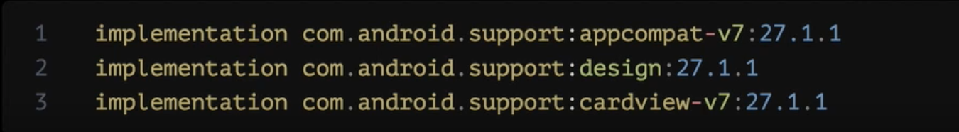 - 서포트 라이브러리는 여러가지의 서포트라이브러리를 사용할 경우 버전을 통일시켜야 된다. 만약 카드뷰 버전 27.1.1에 문제가 있을 경우 다른 라이브러리들 까지 버전 다운을 해야한다.